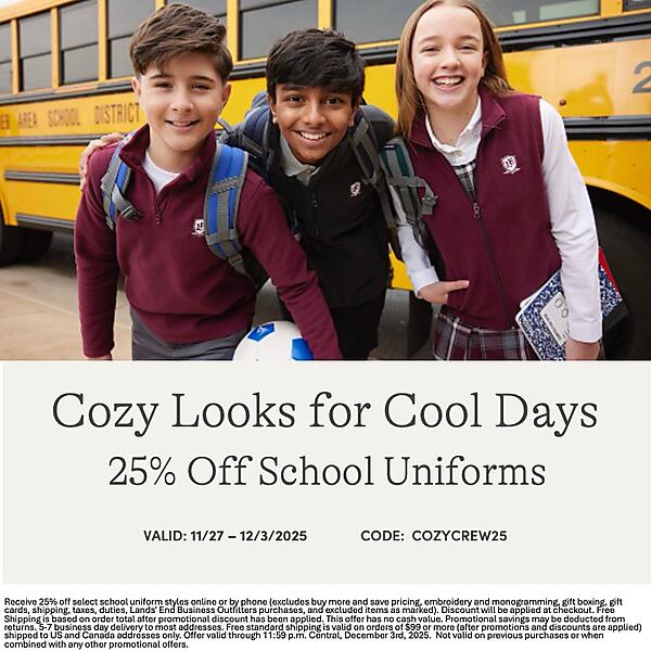 Save on cozy Lands’ End uniform essentials for the winter with a 25% off coupon. Valid from 11/27–12/03. Prepare to stock up and save!